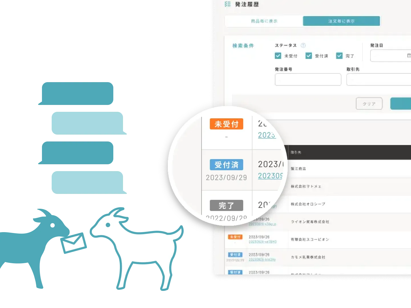 FAXやメールで発生しがちな「送った」「届いていない」のすれ違いをなくし、スムーズなやりとりを実現します。注文情報を見ながら使えるチャット機能も搭載。