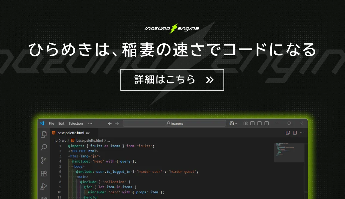 式ベースで値を返却する特化型の独自言語 inazuma⚡code と、多彩な構文が特徴の inazuma⚡templateで、柔軟なページ表現が可能です。