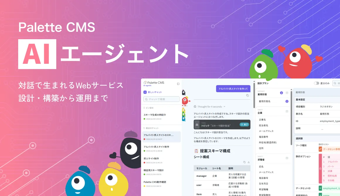 「アイデアが生まれた瞬間、形になる」を体現する、Palette CMSのAIエージェント。設計・構築から運用までをトータルサポートしてくれる、誰より親身な専属アシスタント。