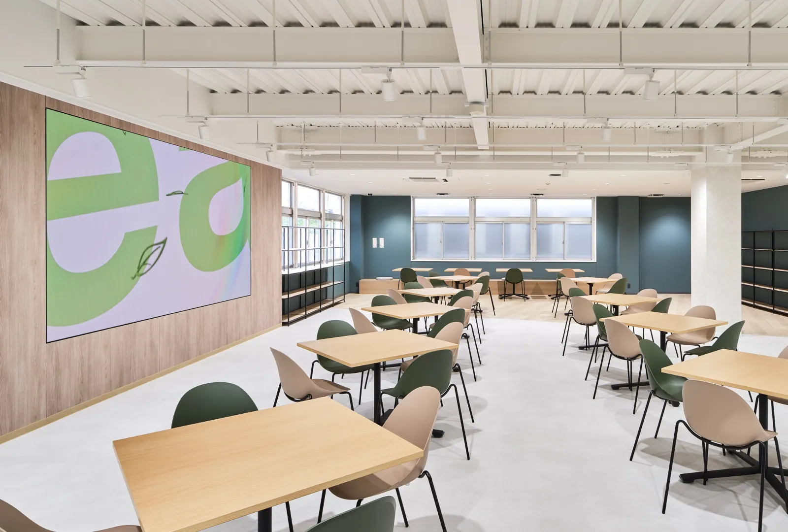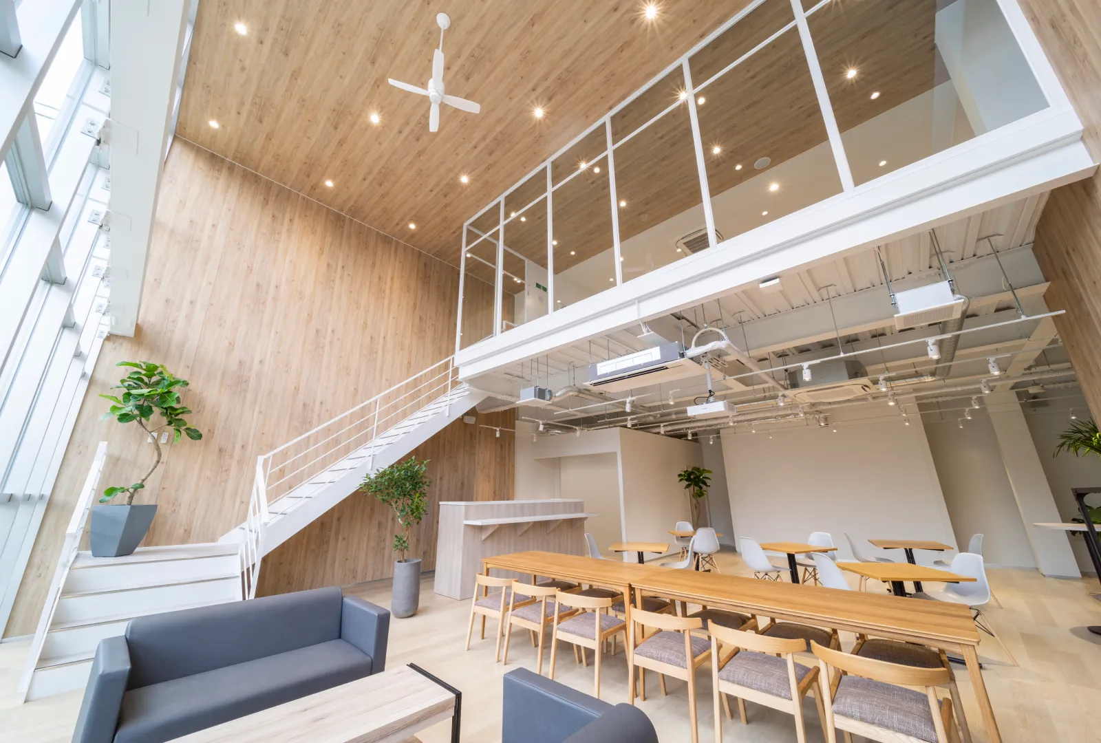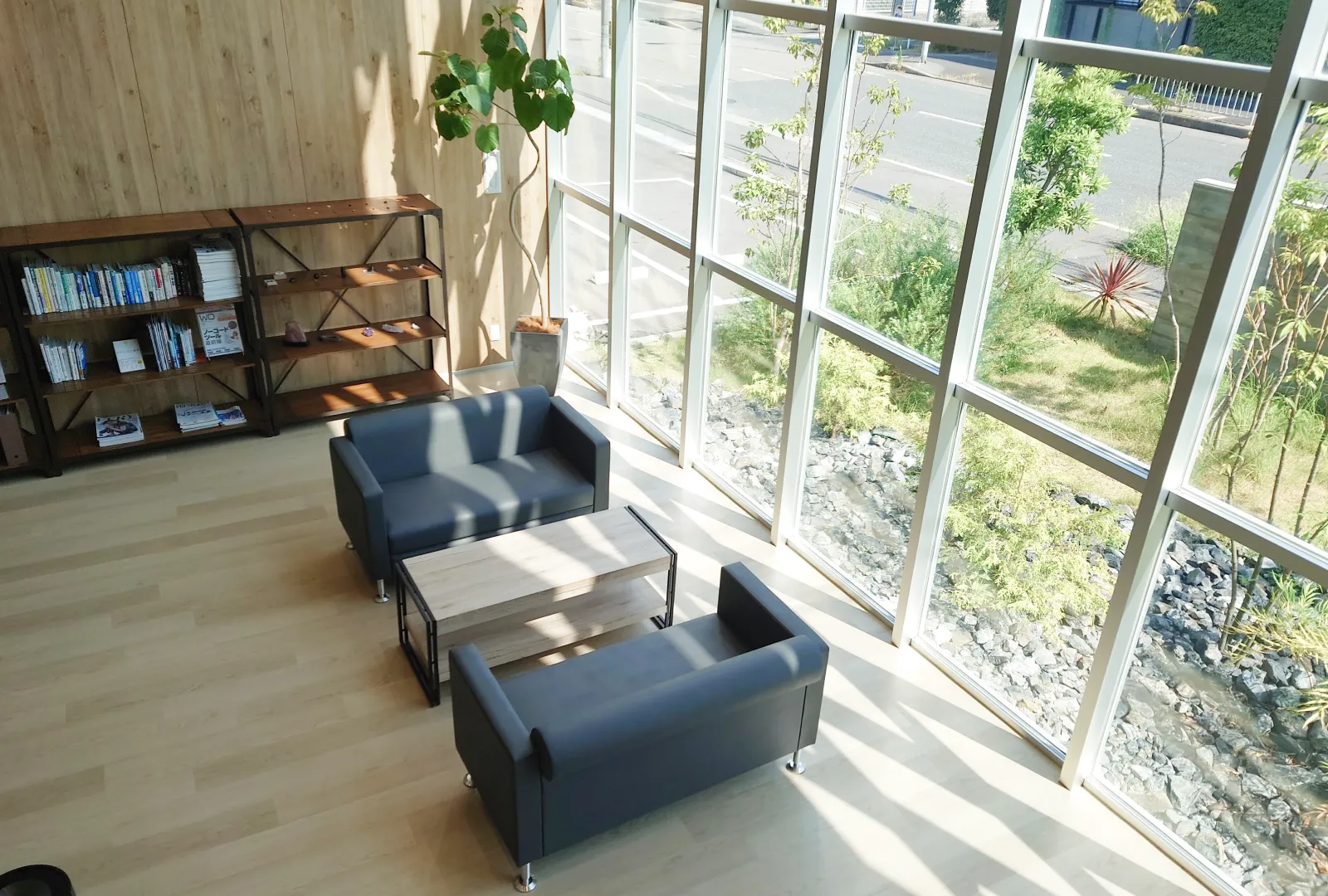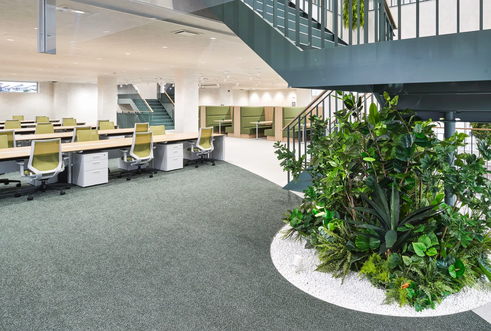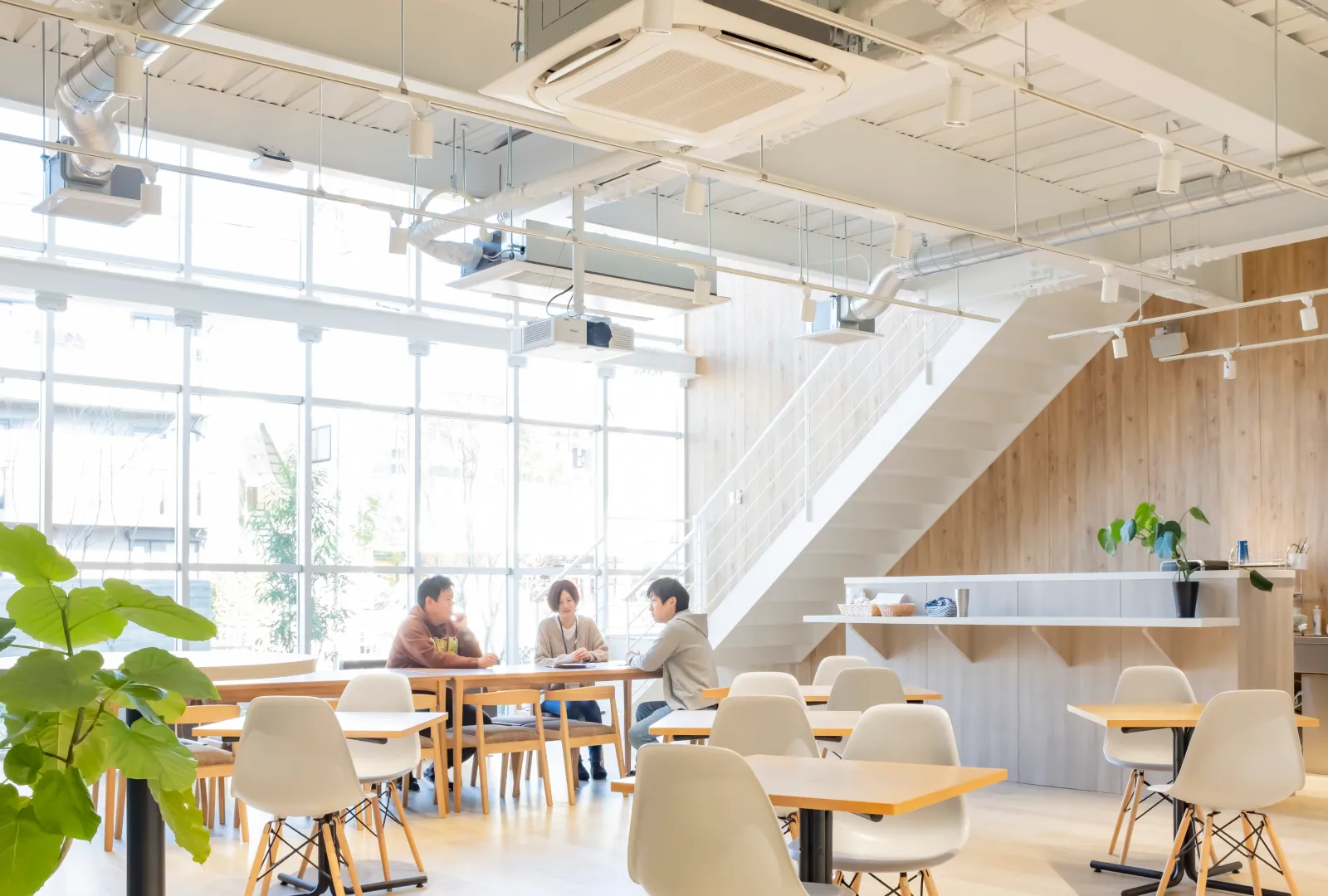 開放感のある大きな窓と、室内外に数多く配置されたグリーンが、リラックスしながら働ける空間を演出しています。