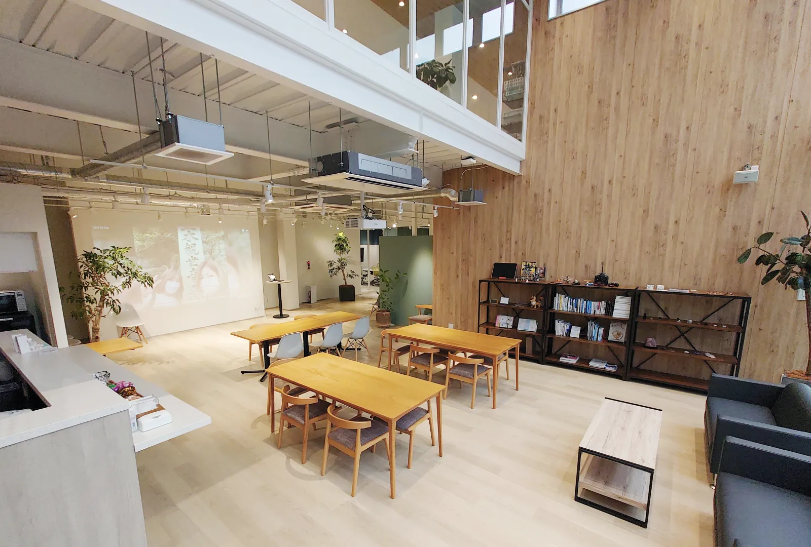 1Fは「出会いと対話」のCommunity Floor、2Fは「思考と没入」のWork & Focus Floor。会議室やプロジェクターも完備しています。