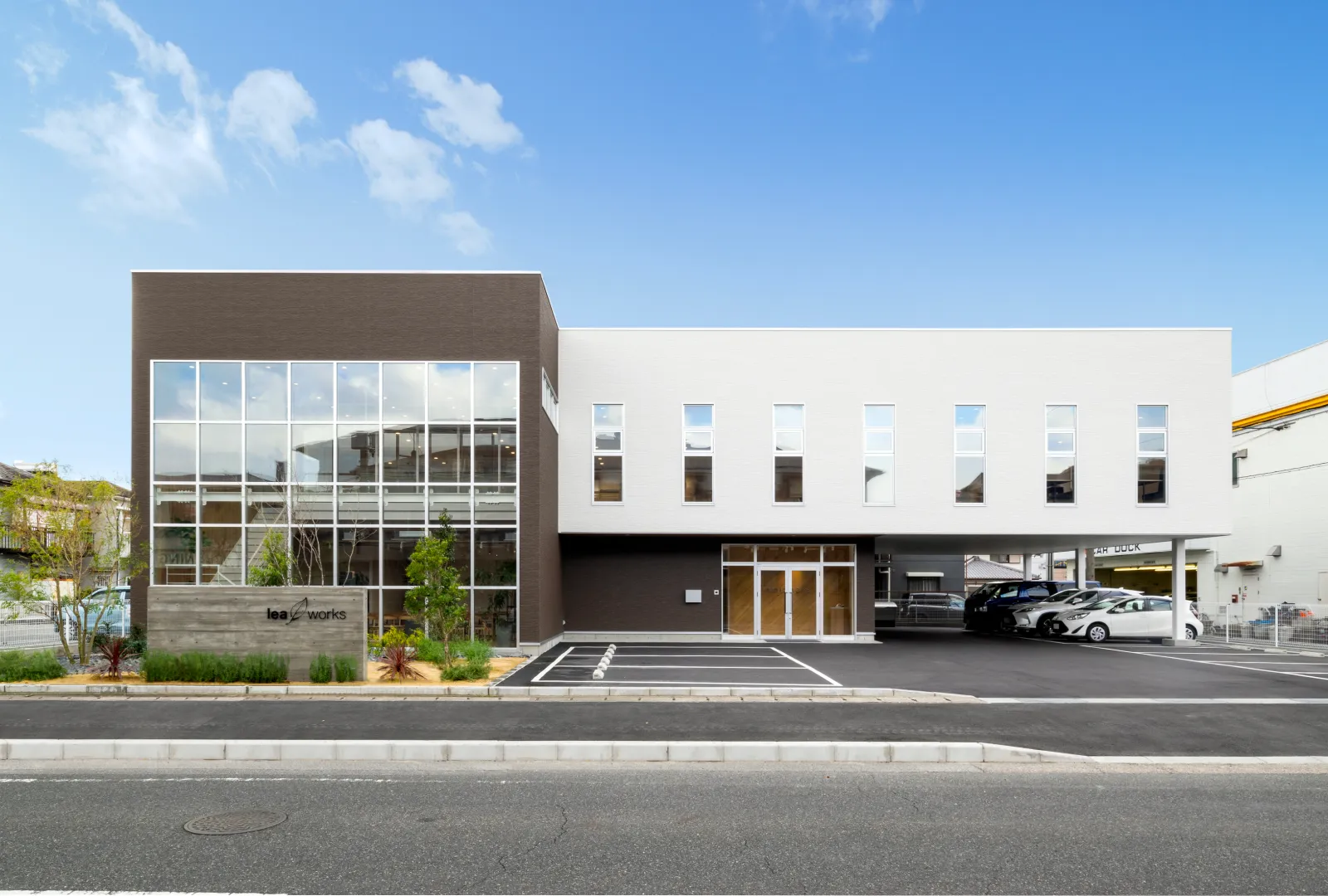 業績拡大と人員増加に伴って竣工した、2棟目の自社ビル。1Fは駐車場とカフェスペース、2F・3Fは執務オフィスです。異なる階でも交流しやすいよう吹き抜けを多用し、通常業務・集中作業・交流の場をゾーニングすることで、働きやすい環境を実現しました。